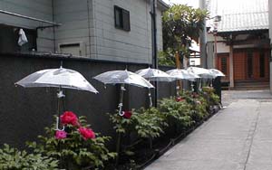 | さてもう1コマは「田町」と「浜松町」のちょうど中間点のお寺の入り口。ボタン専用のビニール傘がありました。ちょっと「お地蔵様」のような感じもしますが、、。街の中のちょっとミスマッチングな景観でGOODです。 |