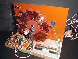 とりあえず完成。ANT(アンテナ)を電話線に巻きつけましたが、何も聞こえず、、。テスターでいろいろチェックすると電池ボックスの端子が絶縁状況。。これは子供には発見できないし、修理もできませんねーー。ばかキットです。ここで無線技師(わっしの事です。)が登場しすばやく修理!完動しました。クリスタルイヤホンから音楽が聞こえてきます。はははは またまた尊敬されるナーー。