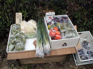 | 起伏の少ない道を10kmくらい北に向かって歩きました。途中由緒有る神社、景行天皇陵、崇神(すいじん)天皇陵などの前方後円墳、柿本人麻呂の句碑などいろいろ出現してきて飽きさせませんが、何と言っても「無人・有人販売所」がひどく多くおもしろいです。季節の農作物等の購入にはGOODです。かき、みかん、ずいき、いも、ざくろなどなど。結構買いました。(^^ゞ |