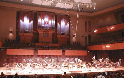 | 井上道義氏指揮、大阪フィルハーモニー交響楽団の演奏会がザ・シンフォニーホールでありました。チャイコフスキーのワルツと交響曲 第5番を相変わらず激しいアクションの指揮での「60分コンサート」です。。Mickey(井上氏)曰く、「短くてグッド、まるでミニスカートだ!」。 写真は演奏が始まる10分前くらいです。コントラバス4名ばかり、チェロが1名、管楽器数名がそろっただけの景色。「そろそろ時間なのでみんなおねがいしまーーす」ってとこですね。じわじわと舞台に集まって来ます。演奏前の少しぴんと張った空気が良い感じでした。あらかたそろってコンサートマスターが最後に登場。ヴァイオリンで全員のキーを合せた後の一瞬の静寂の間に井上氏登場でした。なかなかの演出であります。