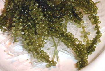 沖縄の郷土の味。 プチプチした不思議な海藻で、クビレツタという海藻の仲間。特に知念村の海ぶどうは、粒が大きくイクラのような食感。空港などでも購入可能。