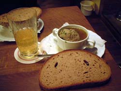 左:りんご酒とレバー団子入りスッペンと黒パン。 右:ポテトとハーブのサワークリームと玉子。 |