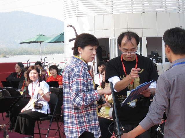 湘湖の屋外特設会場 前夜、日本から杭州のホテルに到着時間も遅く、やや疲労感の有る本番。ホテルから会場までバスで向かいました。 到着後すぐにチューニングと昼食です。劉鋒先生が個々人のチューニングをすべてチェックします。 事前に音響チェック程度のリハーサルをするとのこと。 全員椅子の位置を確かめて、え〜と、、どうも先生の音も聞こえないし、モニターから音が聞こえないので合わせるのがかなり困難、、。 そうこうしてる間にピンマイクなど出てきて、そこそこのところで不時着っす。