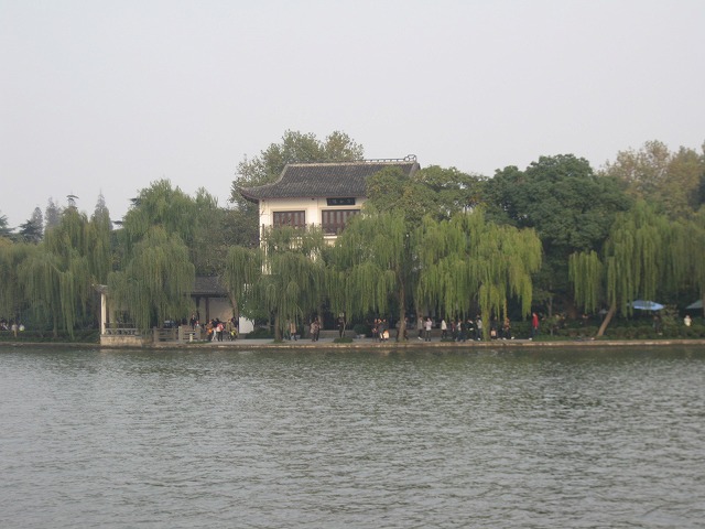 西湖を遊覧船に乗って対岸まで移動。湖面をさわやかな風が吹いていました。