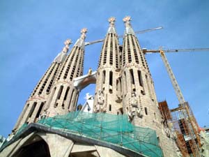 サクラダファミリア正面部。内部の大伽藍は高さ数十メートルの大迫力。エレベーターで尖塔の先までいけます。