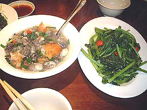 左:素材が並ぶ後ろはいきなり厨房です。見た事ないのもありますよ、。なんだ〜? 右:「牡蠣」の**スープ(笑)と「空芯菜」の炒めもの。