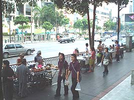 | 出勤前の様子。夜に比べて屋台の台数は減ってますが、朝食用バージョンです。皆さんスーパーのビニール袋を 持ってますがこれが屋台で買った朝食です。 |