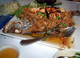 ![]() プ・ラーヌン・シーユ 蒸し魚の料理 ナッツとか野菜が乗ってます。 締まった身です。 |